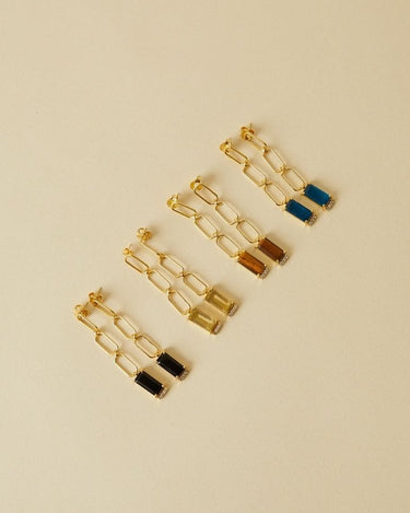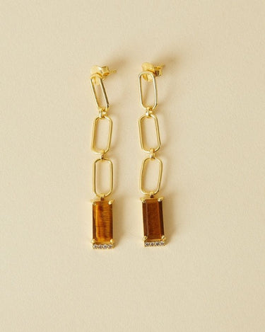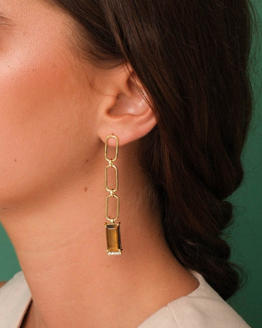 This statement earrings design showcases a sequence of oval-shaped rings with a rectangle cut of natural Tiger Eye gemstone and a thin row of cubic zirconia. A stunning pair of earrings designed to become the finishing touch to your outfit.