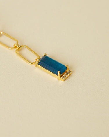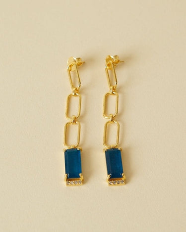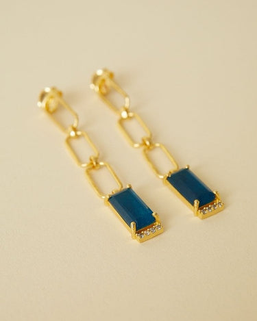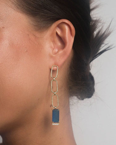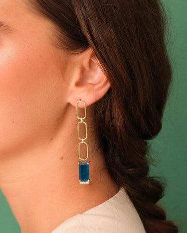 This statement earrings design showcases a sequence of oval-shaped rings with a rectangle cut of natural Blue Black Jade gemstone and a thin row of cubic zirconia. A stunning pair of earrings designed to become the finishing touch to your outfit.