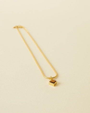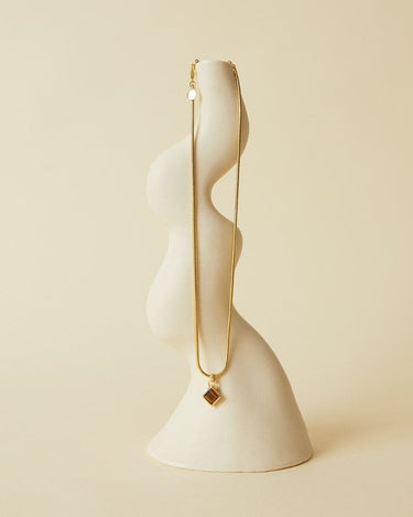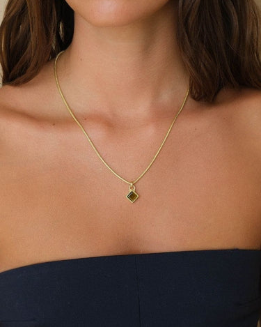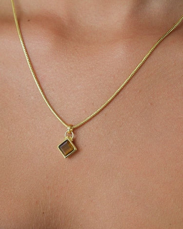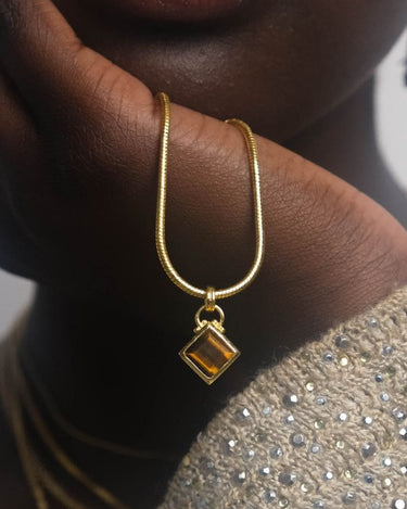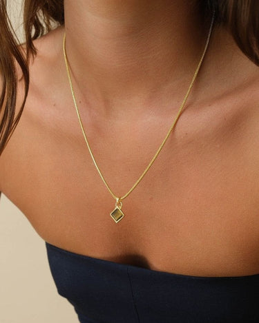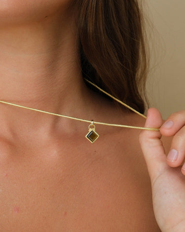 This piece features a square gemstone with a bezel setting. It is rotated 45 degrees to give this oblique/diamond shaped look and paired with Bonito's signature top double ring which fits perfectly through our best-selling Snake Chain or any other Bonito chain.